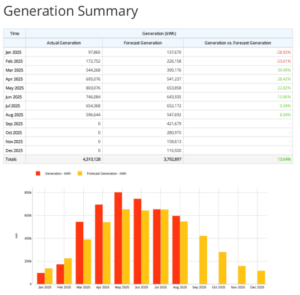 The Twemlows site is well built and well maintained. It is in two halves, here are the 2025 generation figures for Twemlows 1 (Twemlows 2 was very similar), these are 14% up on forecast for the year to date.